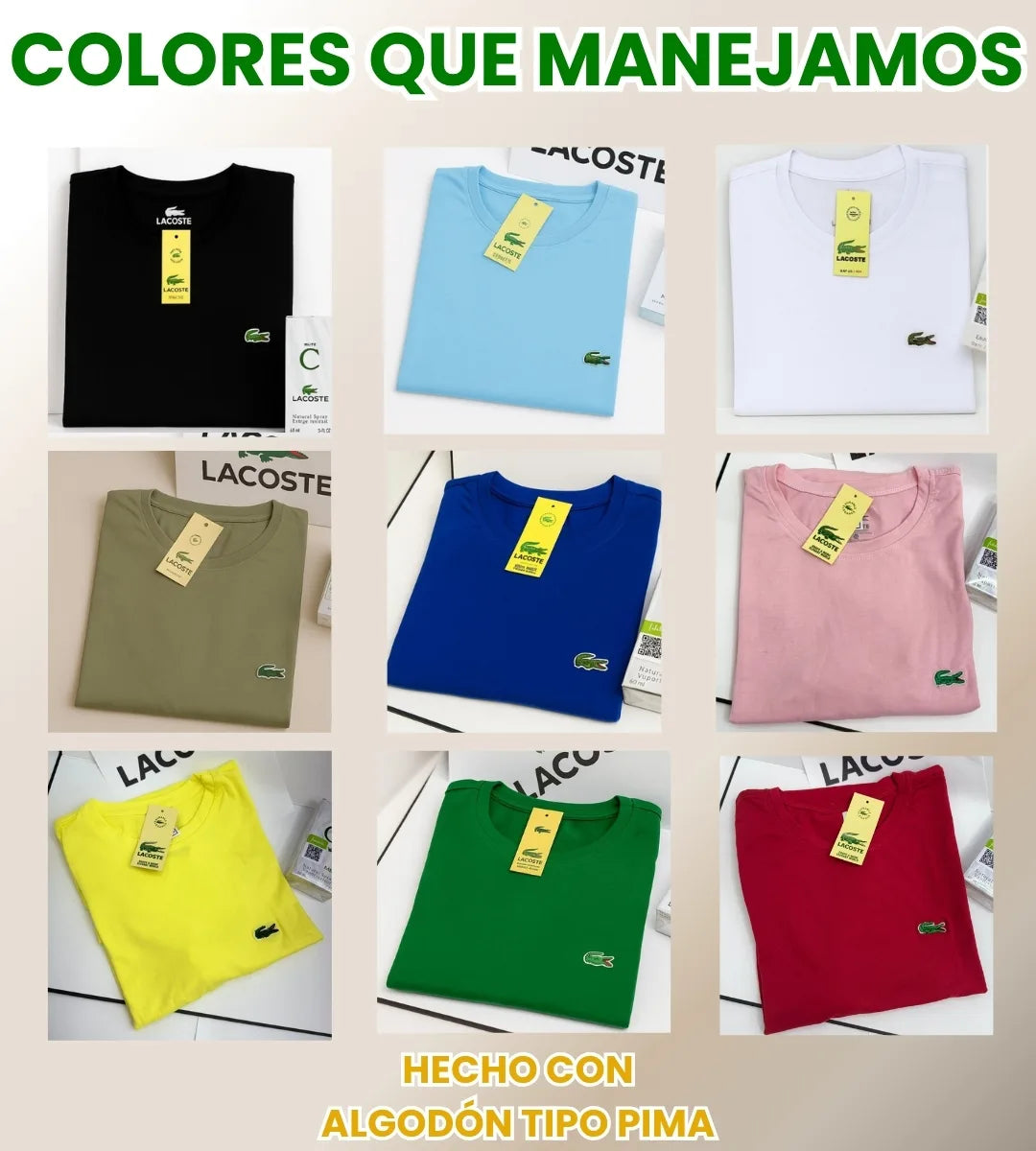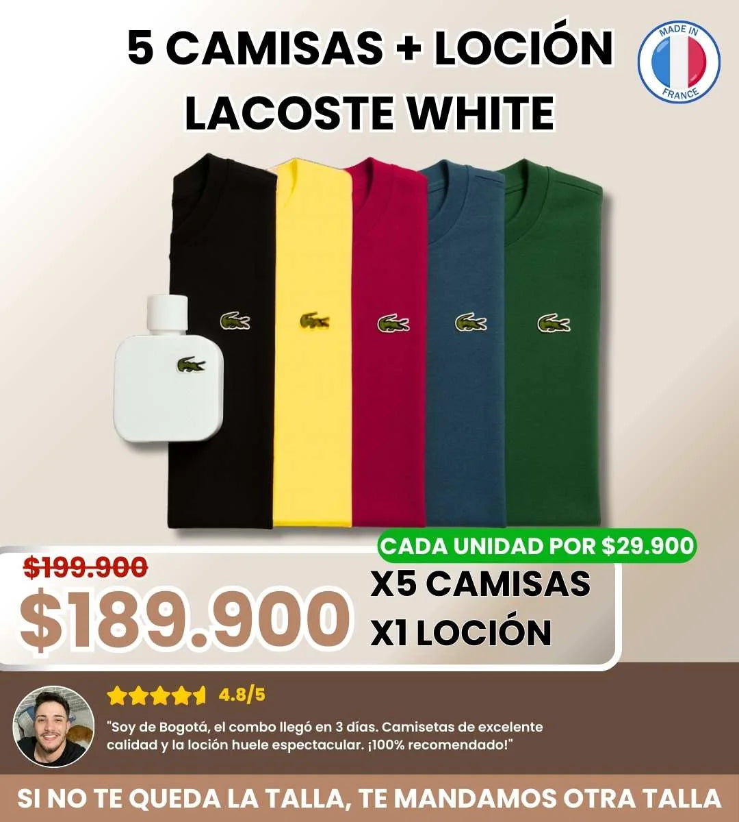 El combo incluye 5 camisetas básicas Lacoste en colores surtidos. Los colores pueden variar según la disponibilidad: Negro, blanco, rojo, azul, verde, rosa, amarillo.